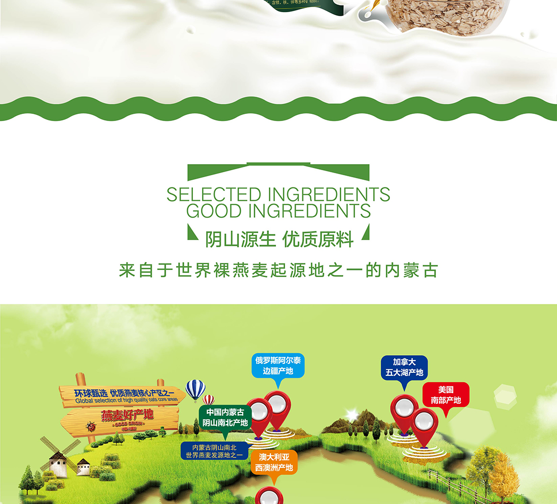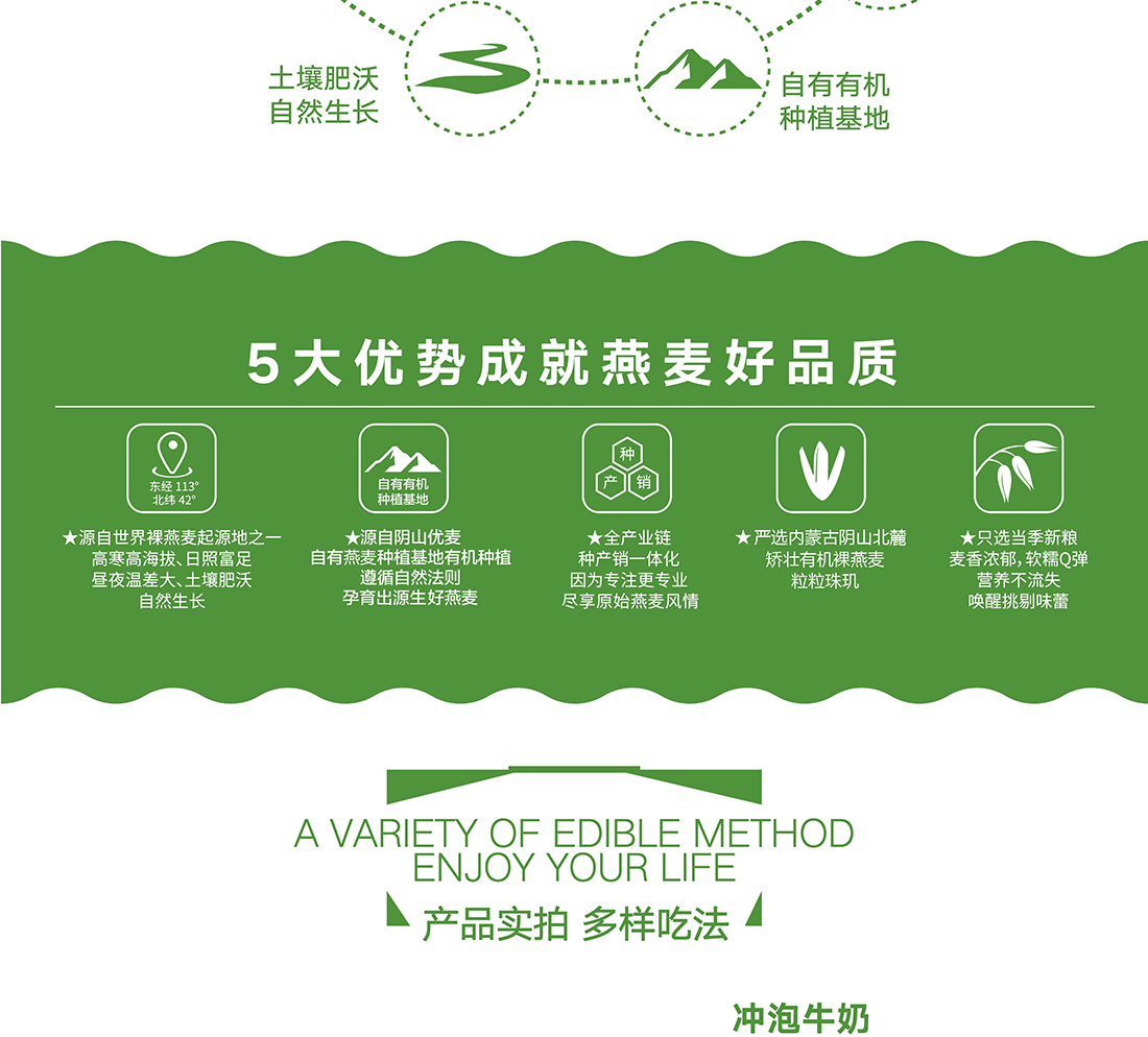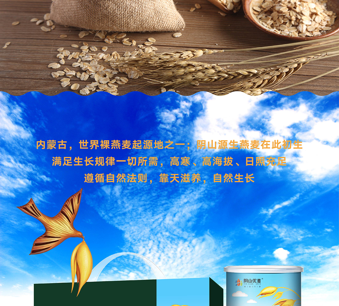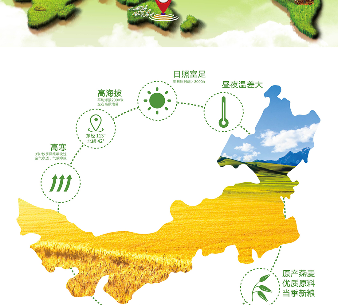 內(nèi)蒙古,世界裸燕麥起源地之一;陰山源生燕麥在此初生滿足生長(zhǎng)規(guī)律一切所需,高寒、高海拔、日照充足;遵循自然法則,靠天滋養(yǎng),自然生長(zhǎng)
